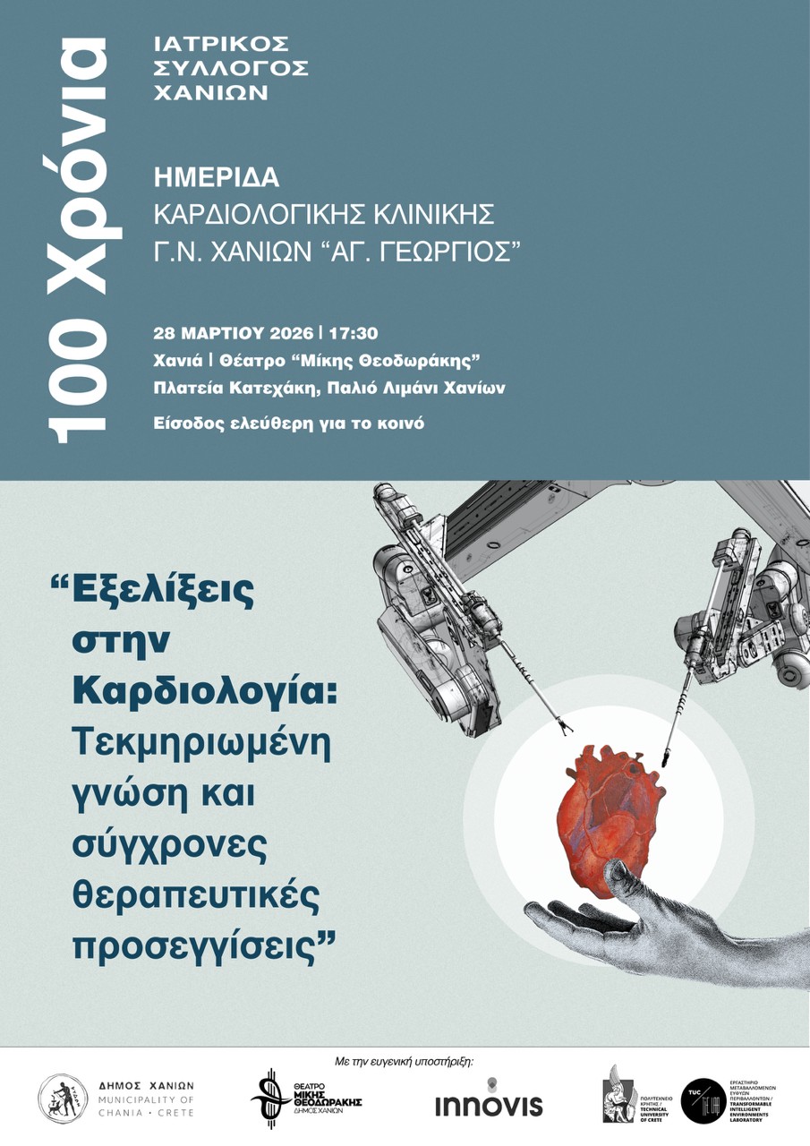 Η ημερίδα θα πραγματοποιηθεί το Σάββατο 28 Μαρτίου 2026, στις 17:30, στο Θέατρο Μίκης Θεοδωράκης, στην Πλατεία Κατεχάκη στο Παλιό Λιμάνι, με τη συνεργασία της Καρδιολογικής Κλινικής του Γενικού Νοσοκομείου Χανίων «Άγιος Γεώργιος».